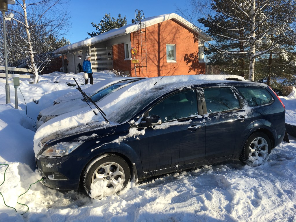 At home the paths need clearing of snow. Snow falling in temperatures below minus 5, is light and fluffy, it is easier if it’s moved before walking on it. Compacted snow is difficult to shift. It’s also better to remove as much snow as possible from paths just in case it melts and re-freezes as more slippery ice. Vehicles parked outside will also need snow moving. The Police don’t like to see mobile igloos on the road. The snow needs clearing for visibility, not forgetting registration number plates and lights, apart from clearing the roadway to drive out. If it snows day after day, this can be an adventure to start with but after weeks of snow, can get a little tedious. It takes about 10 to 20 minutes but it’s time the car can be warming up, remember to start the engine first. At allocated parking spaces we pay for the use of a special electrical socket. We can plug in the car for heating up ready to go. The vehicles are winterised with a heating element inside the engine cooling system and a cabin socket for a small heater. The timer can be set so that the vehicle can be pre-heated for 30 minutes or so and then the engine starts even in minus 20. Heated seats are fairly common and very nice in the very cold weather.