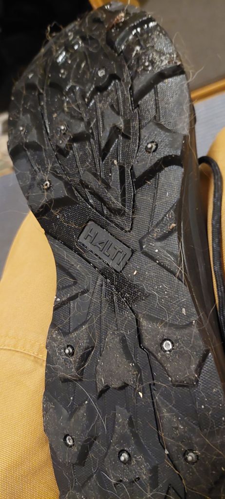 Boots with studs become a necessity, especially when managing pulling dogs. Four legs are better than two in the staying upright stakes and fluff covered paws also maintain a surprising amount of traction.